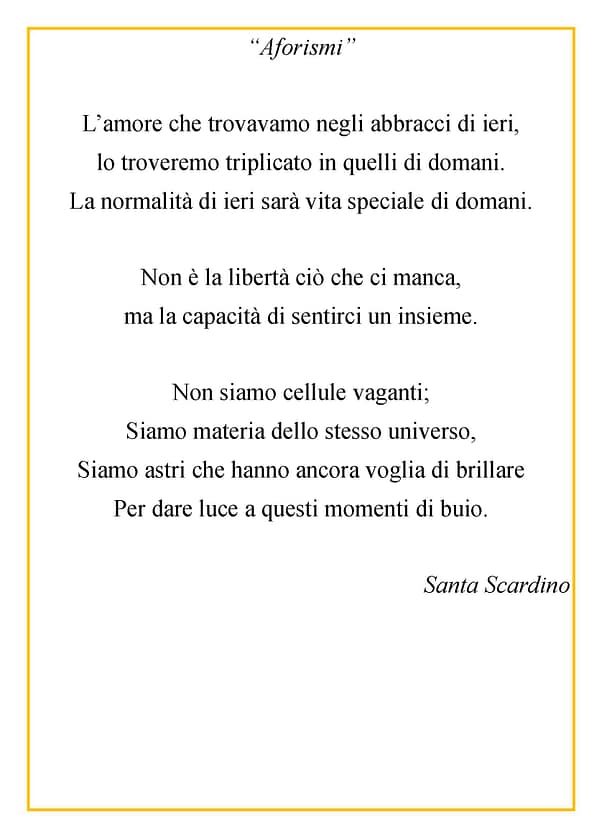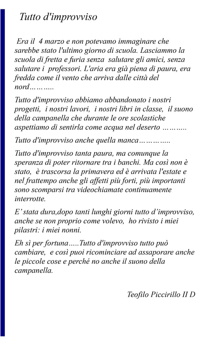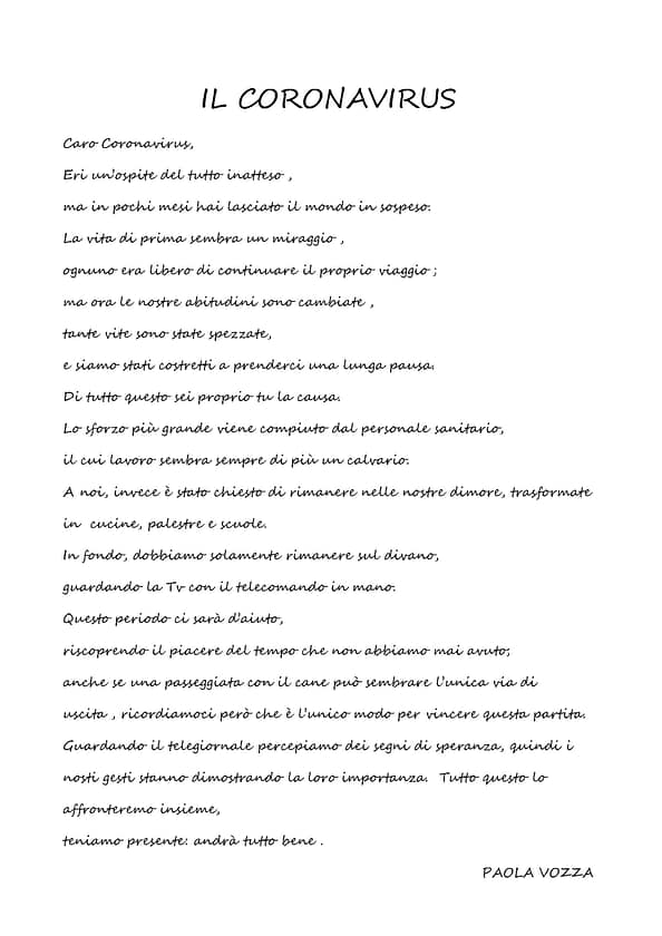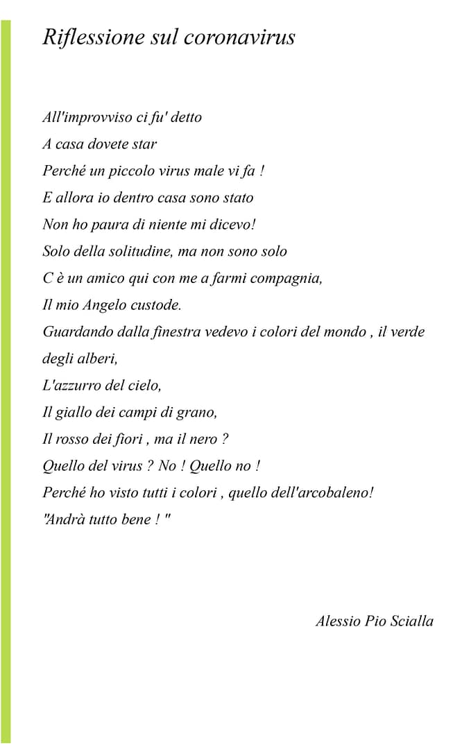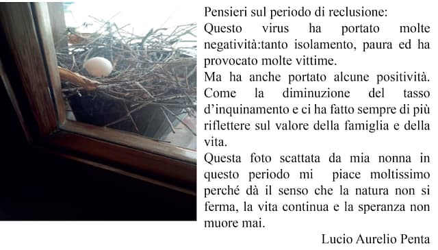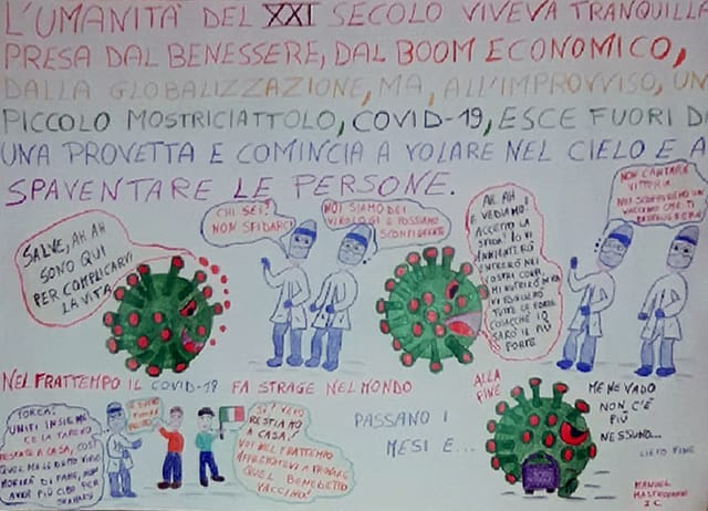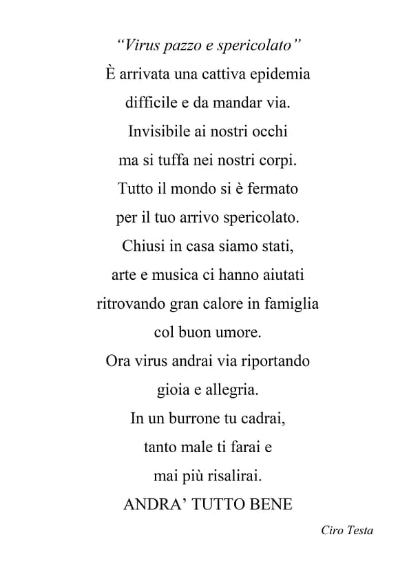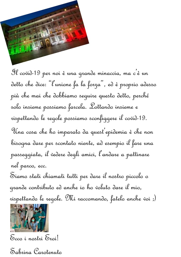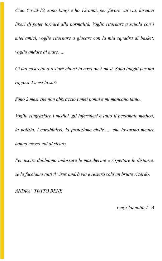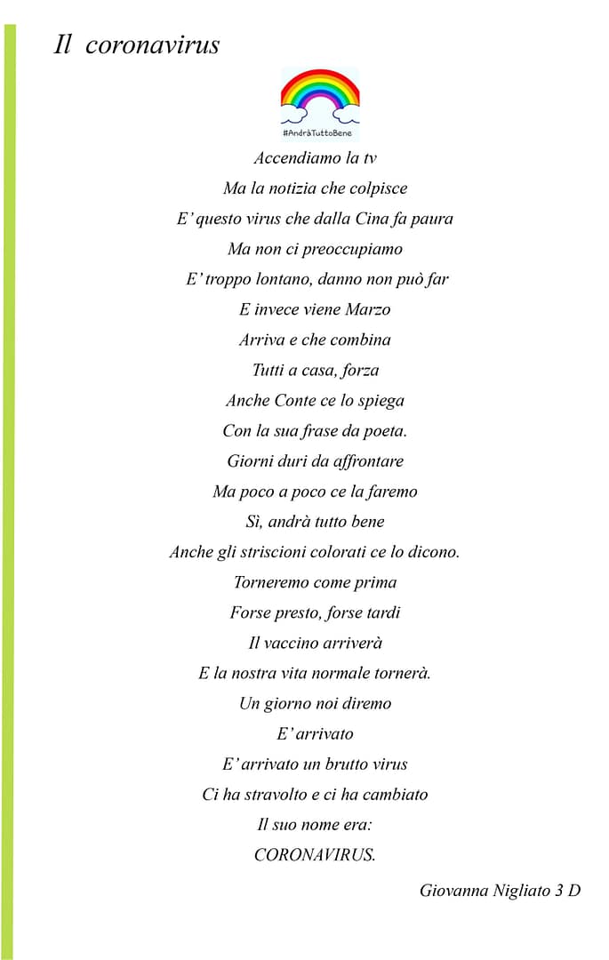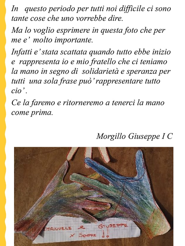 Creatività e speranza sono stati ingredienti perfetti e gli elaborati creati lo dimostrano. Gli alunni dell’I.C. “G. Stroffolini”, coordinati dalla prof.ssa Rosaria Tecchia, e le tante persone comuni che hanno voluto esprimere le proprie sensazioni in questo periodo di grande tristezza sono l’esempio di come, nonostante tutto, siamo capaci di rialzarci ed essere positivi. #andràtuttobene perché non dobbiamo mai lasciare che la paura prenda il sopravvento sulla speranza, perchè se la paura è umana, la creatività è speranza rappresentata in queste foto, video, poesie e pensieri che moltissimi hanno inviato aderendo all’iniziativa.